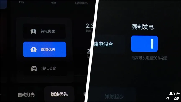 高速行驶时,燃油优先模式展现出强大的适应性与稳定性。增程器与电动机协同工作,确保动力输出持续且强劲。即使面对陡坡或超车场景,只需轻踩油门,理想 L6 便能迅速响应,释放出澎湃动力,让长途驾驶变得轻松惬意。可在任意电量切换至燃油优先模式,当电量低于80%时会启动增程器,优先用油发电,并维持开启时的电量。选择强制发电时,会持续发电并将电量维持在80%左右。开启强制发电时,不管是高速路况还是城市路况,都会进行电量回充,但油耗将显著上升。这一模式主要针对不方便充电或者不想充电的车主,基本把车辆当成燃油车来使用。燃油优先模式下,相比油电混合模式增程器的发电功率会提高,相应的油耗和NVH也会提高。