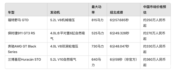 在中国大陆市场,这类高性能跑车的直接竞争对手主要集中于保时捷、奔驰等品牌的顶级车型。以下是与福特野马 GTD的主要竞品对比: