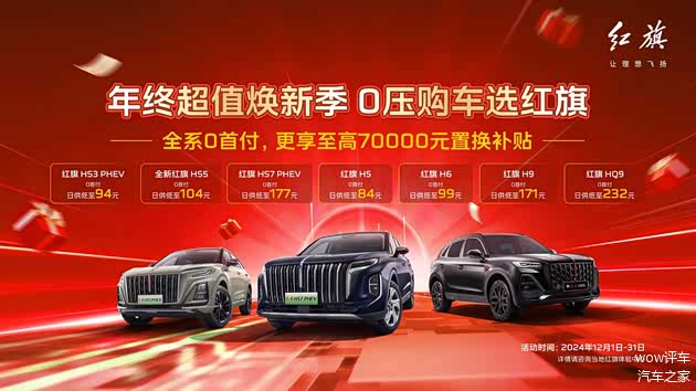 据官方渠道消息,红旗品牌在2024年12月1日至31日期间推出了限时优惠政策。除了刚刚推出2025款的红旗HS5之外,红旗品牌旗下新能源车型HS3 PHEV、HS7 PHEV,燃油车型H5、H6、H9、HQ9,均参与到此次年终优惠政策。感兴趣的朋友可以关注一下年底的限时优惠政策。