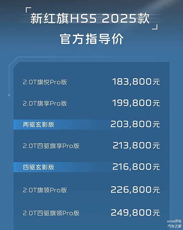 接下来我们就来看看购买配置推荐。2025款红旗HS5,新车共计推出7款配置车型,起售价格从18.38万元~24.98万元。其实还是比较好区分,一共就是四种配置形式,旗悦Pro版、旗享Pro版、玄影版、旗领Pro版,除了入门配置旗悦Pro版,其余每个配置都提供两驱版和四驱版,如此一看就简单多了,从四个配置中选择即可,再看是否有四驱需求。