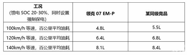 能耗及续航表现是车主们关注的重点,领克07 EM-P在馈电工况,SOC 20-30%,开启强制保电,车辆分别以100km/h、120km/h、140km/h车速行驶,测试百公里油耗。