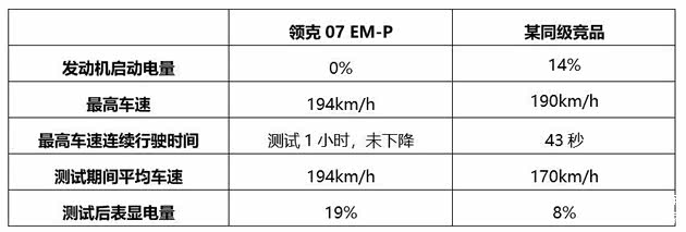 高速稳定性项目主要测试车辆保速与保电的能力。混动车高速失速关乎驾驶安全,比纯电车电量焦虑更要命,不过,领克07 EM-P的测试成绩并没有让人失望,馈电工况下,表显电量为0%时,还能以最高车速194km/h稳定行驶1小时,结束后表显电量从0%升高至19%,电量回充效果显著。