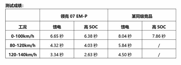 在0-100km/h加速测试中,领克07 EM-P即使在馈电情况下,零百加速也能达到6.65秒,比同级对手快出一截;80-120km/h速段下,该车型馈电加速达到4.32秒;120-140km/h速段下,该车型在高SOC工况下,加速达到2.63秒,这一成绩比不少燃油性能车更出众。