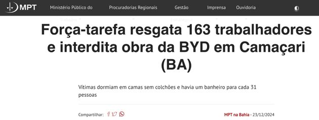 日前,据外媒报道,巴西工作组调查发现比亚迪位于巴伊亚州卡马萨里市工厂里的163名工人生活在条件艰苦的环境中,并给出所有住宿都存在严重的基础设施和卫生问题的判断。