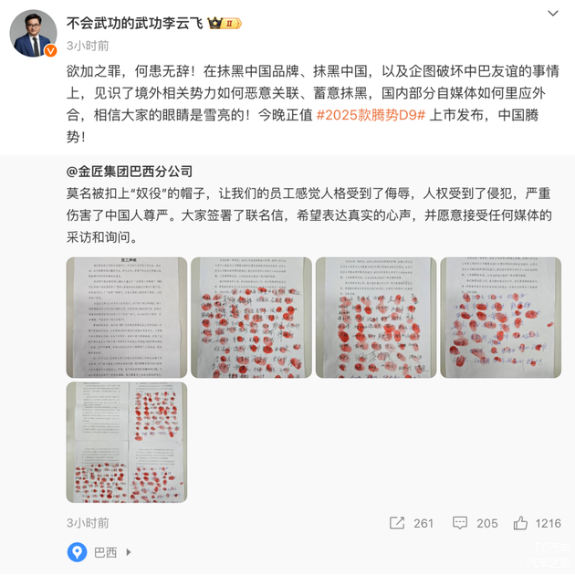 员工们在声明中明确澄清,金匠公司并未扣押他们的护照,护照留在公司仅是为了办理巴西临时身份证及税号,一旦证件办理完成,公司将立即归还护照。由于巴西劳工部门的调查,劳工部要强制金匠集团与员工解除合同,并将员工遣返回中国,遣返的原因是金匠集团存在“奴役”的行为。员工表示,这完全是一场误会,金匠集团没有扣押我们护照,没有受到公司对于人身自由的限制,工资都照常发放,公司也给我们提供了相关福利保障。当天下午,比亚迪集团品牌及公关处总经理李云飞也于今日午间转发微博表示,“欲加之罪,何患无辞!”