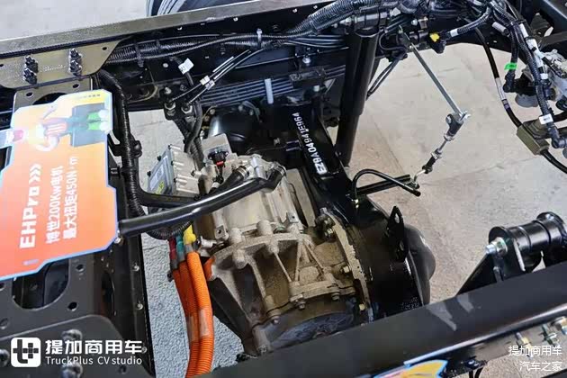 驾驶室底部放了电池,所以电控蓝擎EHPRO采用了侧置的布局方案。这辆蓝擎EHPRO的多合一电控来自博世,采用SIC碳化硅工艺,电控工作发热量降低,在保证工作性能的同时也能降低发热导致的电能损耗。
