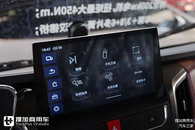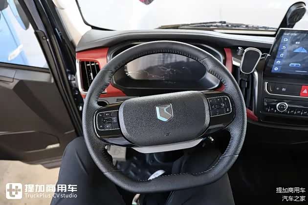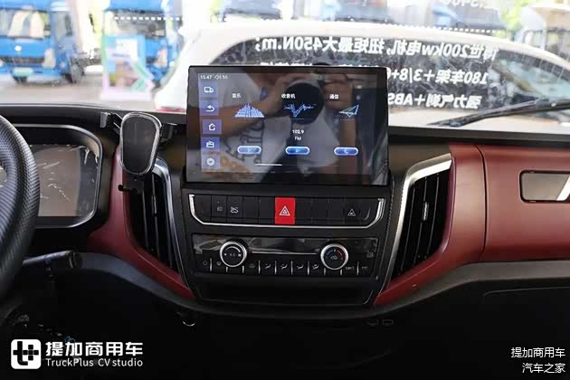 工作台为对称式设计,上方带有一块12.3寸的液晶大屏,支持手机互联、导航、音乐等app生态,驾乘娱乐性有所提升。下方按键区与空调面板分隔明显,以便于驾驶员实现盲操作,在工作台最下方还带有24V 240W取电口和两个USB充电口。