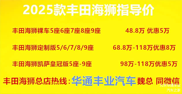 丰田海狮2025 款落地价 丰田海狮4s店【丰田海狮官方授权店】丰田海狮6座售价范围在45W 至108W之间,7座价格区间为42W至88W,8座则是45W至85W,而9座价格为41W至82W。车型提供白色、金色、黑色等多种外观颜色选择.