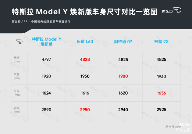 车身尺寸方面,特斯拉焕新 Model Y 长宽高分别为 4797/1920/1624mm,轴距为 2890mm。