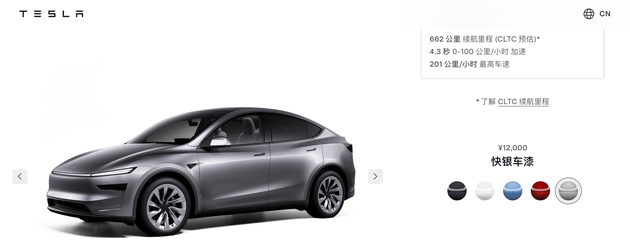 此外,特斯拉焕新 Model Y 还提供「星空灰」、「珍珠白」(选装价 6000 元)、烈焰红(选装价 1.2 万元)以及「快银」(选装价 1.2 万元)四款车漆配色。