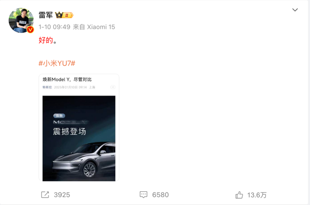 小米,作为国产新能源汽车的新锐力量,率先站了出来。雷军的一条简短微博,以“好的”二字回应了特斯拉的挑战,简短却有力。而小米尚未发布的 小米YU7,更是被视为这场“宣战”的先锋部队,备受瞩目。它不仅仅是一款产品,更是中国车企向特斯拉发起挑战的象征。