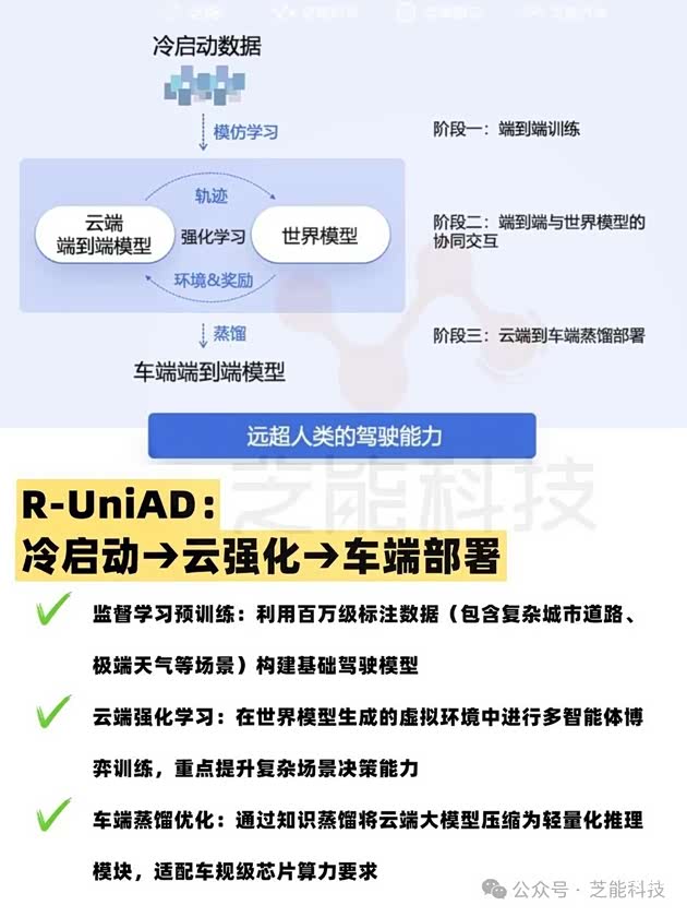 ◎ 云端强化学习:在世界模型生成的虚拟环境中进行多智能体博弈训练,重点提升复杂场景决策能力。