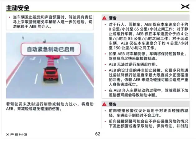 小鹏汽车的回应则是:“我司在车辆随车手册中明确指出,自动紧急制动功能(AEB)无法对逆行车辆发挥作用。”