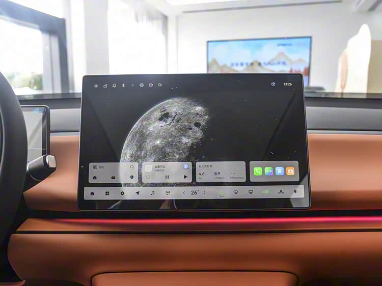 从一堆按键但没有屏幕的油车到车内两块大屏幕却没有按键的新能源车,这种视觉上冲击真的很大,不过零跑C10的内饰确实很好看,简单又清爽,选的黑色+赤霞橙的双拼内饰,不沉闷还耐脏,车内配了10.25英寸液晶仪表和14.6英寸的悬浮式中控屏,采用隐藏式空调出风口,中控屏尺寸大,分辨率是2.5K,黑边窄,屏幕显示面积大,看着细腻柔和,内置高通骁龙8295芯片,这个是当下非常好的配置了,车机系统是Leapmotor OS,界面跟家里用的PAD平板电脑差不多,好看也好用,摸索几下就能上手,空调、导航等功能在屏幕下方都有快捷按键,详细的车辆设置可以用左边的菜单栏来控制,车机里面有不少APP可以用,嫌触屏麻烦也可以用语音来控制一些功能,比如打开空调调到多少度,播放歌曲、导航到XX地方都可以用语音来完成,用习惯之后觉着也挺方便的,动动嘴就行了,不用在伸手了,识别的精度也够高。