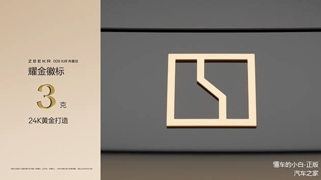 - 金徽标让光辉值得典藏:极氪009光辉典藏版用黄金打造徽标,在车头、车尾以及轮毂上的7个徽标中,加入了3克24K黄金,真正拥有了可以穿越时间的价值和值得典藏的意义。