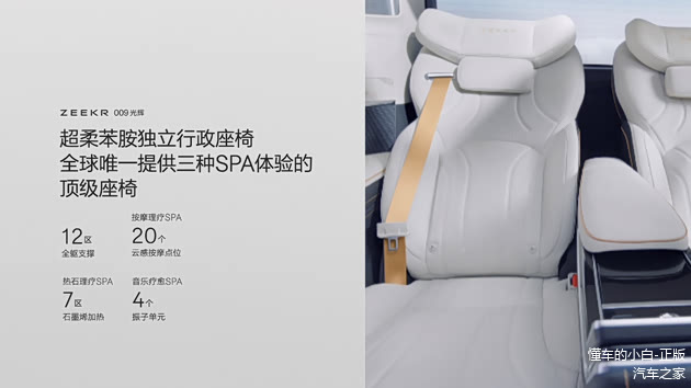 极氪009光辉不仅提供极致的安全守护,穿越时间的价值,还能创造让人心生愉悦的体验。价值50万一把的座椅,采用当前汽车行业最顶级的超柔苯胺真皮,与劳斯莱斯同源,都来自德国巴伐利亚没有围栏的天然牧场,而且经过严苛筛选后,最终能用于包覆座椅的优质皮料,只有不到3%。同时,这把独立行政座椅使用了11层结构以及12个区域的人体工学支撑,带来20个点位的按摩理疗,以及覆盖全身7个区域的石墨烯热石SPA体验。
