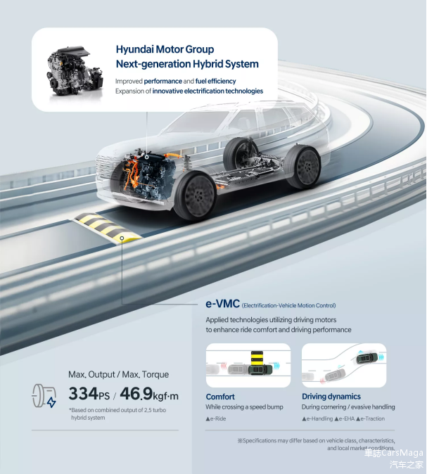 新型混动系统将使用Smartstream G2.5T涡轮增压直列四缸发动机(代号G4KS),内部使用了增强气缸流量和针对混动形式优化的高效循环,以及新的活塞设计和升级燃油喷射系统。发动机最大扭力输出为353牛·米/1800~4500转,最大马力258匹/5800转。电机最大功率输出54千瓦,最大扭力264牛·米,电池组容量为1.65千瓦时。综合最大扭力输出460牛·米,最大马力329匹。相比起纯内燃机,混动单元的扭力和马力输出分别提高了9%和19%,更重要的是,燃油经济性提升了约45%,接近一半的提升,可谓是十分惊人。在2.5T发动机后,现代汽车未来还会推出搭配1.6T直列四缸发动机使用的混动单元,燃油经济性比起纯内燃机提升4%以上,扭矩输出提升13牛·米,从而在入门级车型上换装新一代混动单元,据闻首台搭载车型将会是一台新推出的中E-SUV上。