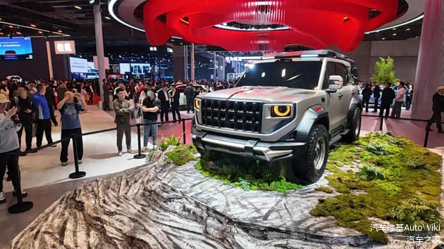 摆在展台最高处的,就是红旗首款豪华硬派越野车,它是首次公开亮相,采用非承载式车身结构与矢量控制四电机技术,最大扭矩达18500牛·米,百公里加速4秒级水准。