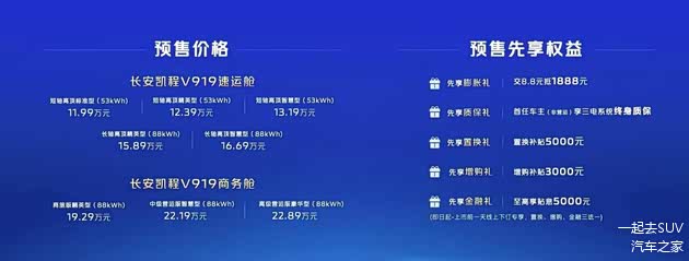 目前,预售期间下订长安凯程V919的车主还可享受一系列先享权益,包括:先享膨胀礼:交8.8元抵1888元;先享质保礼:非营运首任车主享三电系统终身质保;先享置换礼:置换补贴5000元;先享增购礼:增购补贴3000元;先享金融礼:至高享贴息5000元(置换、增购、金融三选一)。