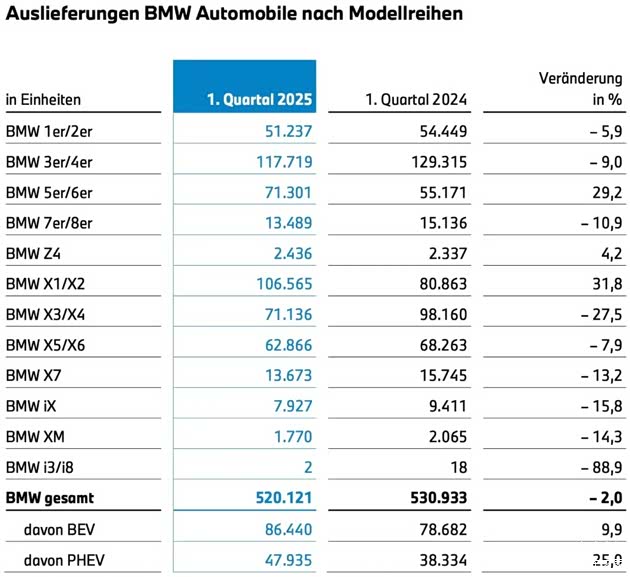 近日宝马集团正式公布了2025年第一季度的销量和财报数据,在各个车系具体销量的图表里,我发现了宝马i3/i8的销量为2辆,没错,是全球共2辆,同比减少了88.9%,关键是这两款宝马早就已经停产了啊,那这肯定是库存了呗!