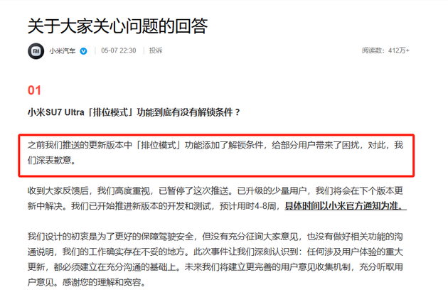 5月7日晚间,小米汽车就近期 小米SU7Ultra车型引发的“排位模式”解锁条件变更以及碳纤维双风道前舱盖功能表述不清这两项争议,发布官方回应并两次致歉。