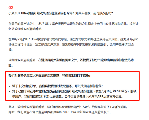 - 与此同时,小米SU7Ultra的碳纤维双风道前舱盖也陷入争议。有车主质疑其实际功能与宣传有差别,认为它仅仅是外观装饰,没有达到预期的气流导出和散热效果。小米汽车回应表明,前舱盖确实具备部分气流导出和辅助前舱散热功能,不过也承认之前信息表达不够清晰。为此,对于未交付订单,小米将提供限时改配服务,可改回铝制前舱盖;对于已提车和在5月10日23:59:59前选配碳纤维双风道前舱盖的锁单用户,将赠送2万积分以表诚意。
