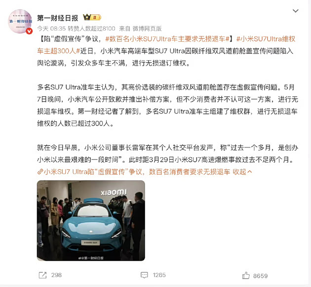 最近小米汽车的高端车型SU7 Ultra因一个碳纤维前舱盖,意外成为舆论风暴中心。到底咋回事?咱们来好好捋一捋。