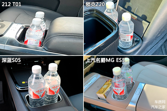 杯架测试中,虽然四款车型前后排均分别配备了2个杯架,但在限位器数量方面,领克Z20和上汽名爵MG ES5表现出色,四个杯架均有配备。而212 T01和深蓝S05仅前排杯架内配备了限位器。