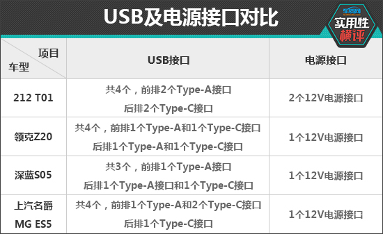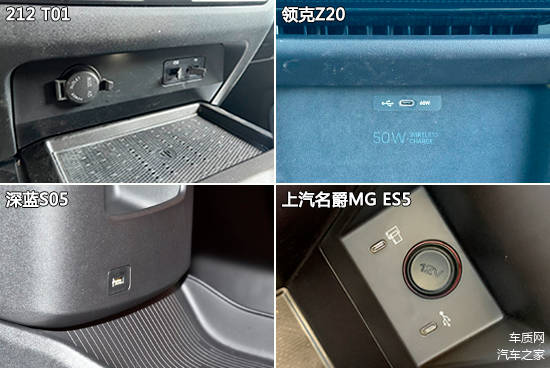 充电接口方面,除了深蓝S05,另外三款车型均配备了4个USB接口,其中领克Z20前后排涵盖了Type-A和Type-C两种类型接口,实用性表现最佳。此外,四款车型均配备12V电源接口,可以满足日常所需。其中,212 T01提供了2个,值得点赞。