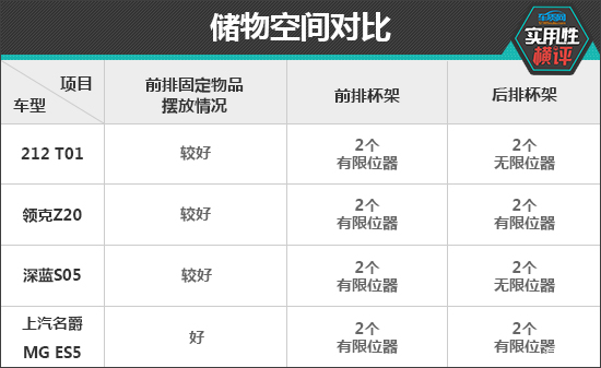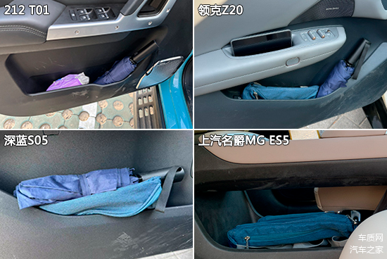 车内储物空间方面,上汽名爵MG ES5的表现最佳,所有测试物品均有合适的位置放置,储物能力出色。领克Z20和深蓝S05是墨镜没有合适的地方存放,而212 T01则是挎包无法合理储存。