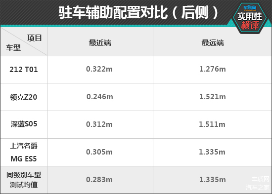 在后驻车雷达测试中,领克Z20和深蓝S05的最远探测能力均比较优秀,实测分别达到了1.521m和1.511m。在持续蜂鸣阶段,则是上汽名爵MG ES5与同级别车型测试均值最为接近。