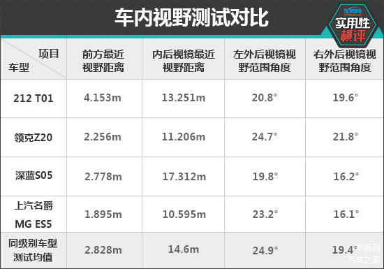 实测过程中,上汽名爵MG ES5的前方视野测试成绩表现不错,达到了测试过的同级别车型上游水平。相比之下,212 T01的前方视野盲区相对较大,测试成绩为测试过的同级别车型下游水平。在内后视镜最近视野距离测试中,依旧是上汽名爵MG ES5表现最为出色,而深蓝S05则未达到同级别车型测试均值。