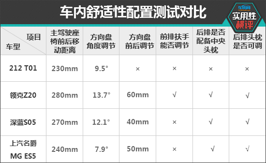 主驾驶座椅前后移动距离方面,领克Z20以280mm的测试数值领先,而212 T01仅为230mm,表现垫底。方向盘调节方面,同样是领克Z20最为出色,整体表现优于其他三款车型。