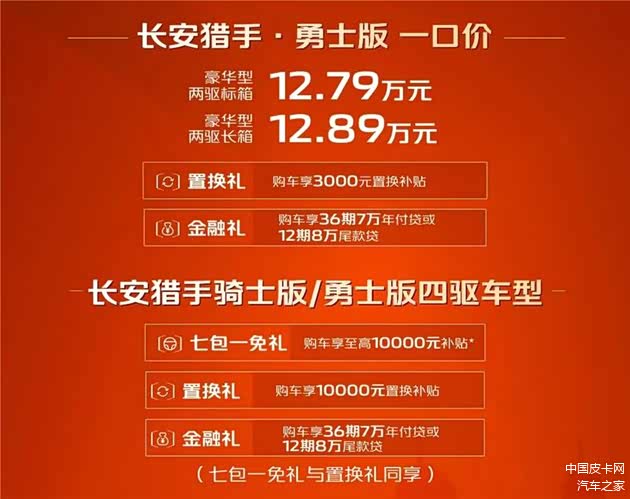 作为新能源带边品牌,长安同样开展新能源皮卡普及行动,至高优惠20000元。其中,长安猎手勇士版两驱标箱豪华型一口价12.79万元(长箱版加1000元),还可享受3000元置换补贴,以及36期7万年付贷或12期8万尾款贷;长安猎手骑士版/勇士版四驱车型可享至高10000元的七包一免礼、10000元的置换礼和金融礼。