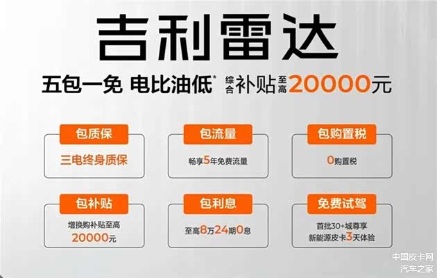 吉利雷达推出新能源皮卡普及行动,5月1日-31日,购买24款雷达地平线、23款雷达RD6可享综合补贴至高20000元,同时还有三电终身质保、畅享5年免费流量、0购置税、增换购补贴至高20000元,至高8万24期0息,首批30+城尊享新能源皮卡3天体验等“五包一免”活动。