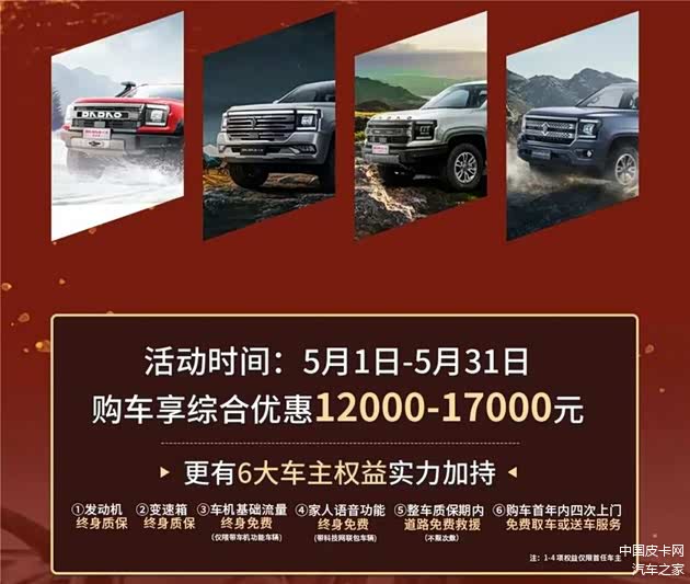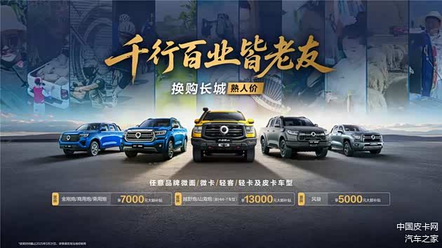 作为皮卡市场半壁江山,长城推出具有诱惑力的优惠补贴。即日起至5月31日,任意品牌微面/微卡/轻客/轻卡及皮卡车型置换长城皮卡,可享5000元至13000元大额补贴。其中,置换风骏享5000元大额补贴,置换金刚炮/商用炮/乘用炮享7000元大额补贴,置换越野炮/山海炮(除山海炮Hi4-T车型)享13000元大额补贴。