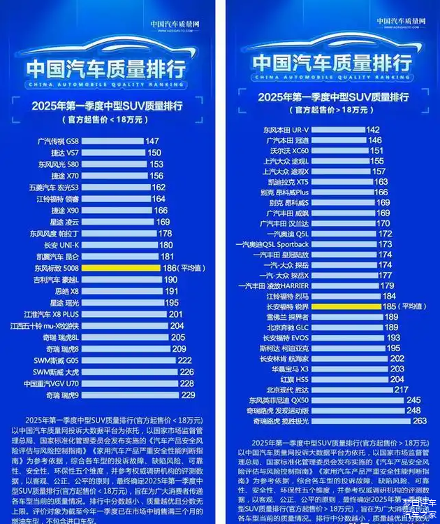 接下来是2025年中型燃油SUV质量排行,榜单也被分为两部分,其中起售价低于18万元的有捷途X70、福特领睿、长安UNI-K和捷达VS7等车型质量达标。而起售价高于18万元的中型SUV,知名车型沃尔沃XC60、途观L都是名列前五,凯迪拉克XT5、昂科威、丰田威飒和汉兰达也是入榜前十,奥迪Q5L、皇冠陆放和探岳等月销过万的车型,质量表现同样是处于行业平均值之上。