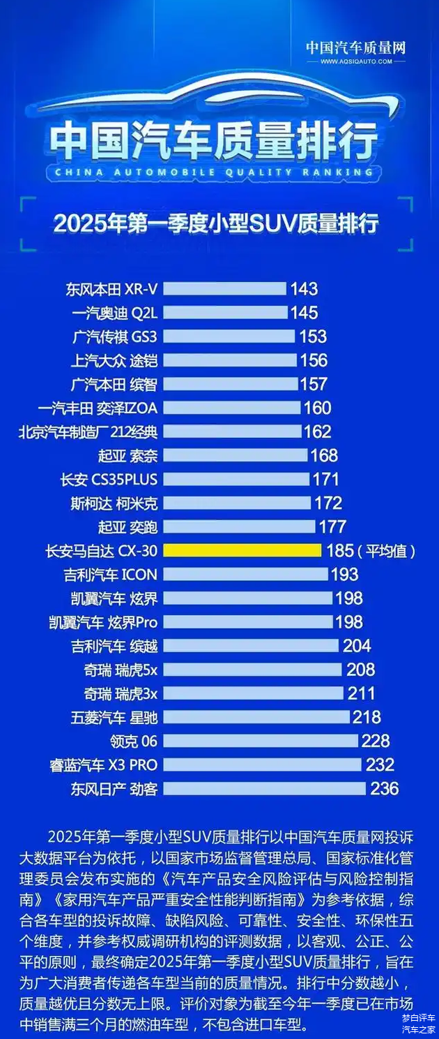 具体方面,首先来看下2025年小型燃油SUV质量最新排名,传统车型本田XR-V、传祺GS3、大众途铠和本田缤智全部是入榜前五名,且质量分数都未超过160分。丰田奕泽IZOA、起亚索奈、长安CS35 PLUS以及斯柯达柯米克同样是入榜前十,长安马自达CX-30则与行业平均值持平。