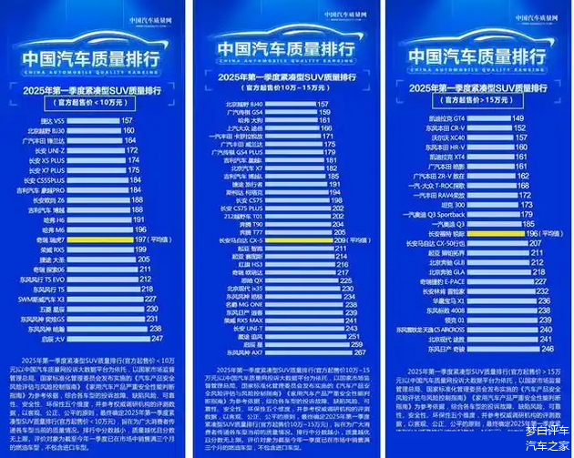 再来看下2025年紧凑型燃油SUV质量最新排行,根据起售价不同,榜单共分为三大部分!其中,起售价低于10万元的紧凑型燃油SUV,捷达VS5夺得了头名,锋兰达、博越、长安CS55 PLUS、哈弗H6和哈弗M6等月销过万的车型,质量表现都还不错。