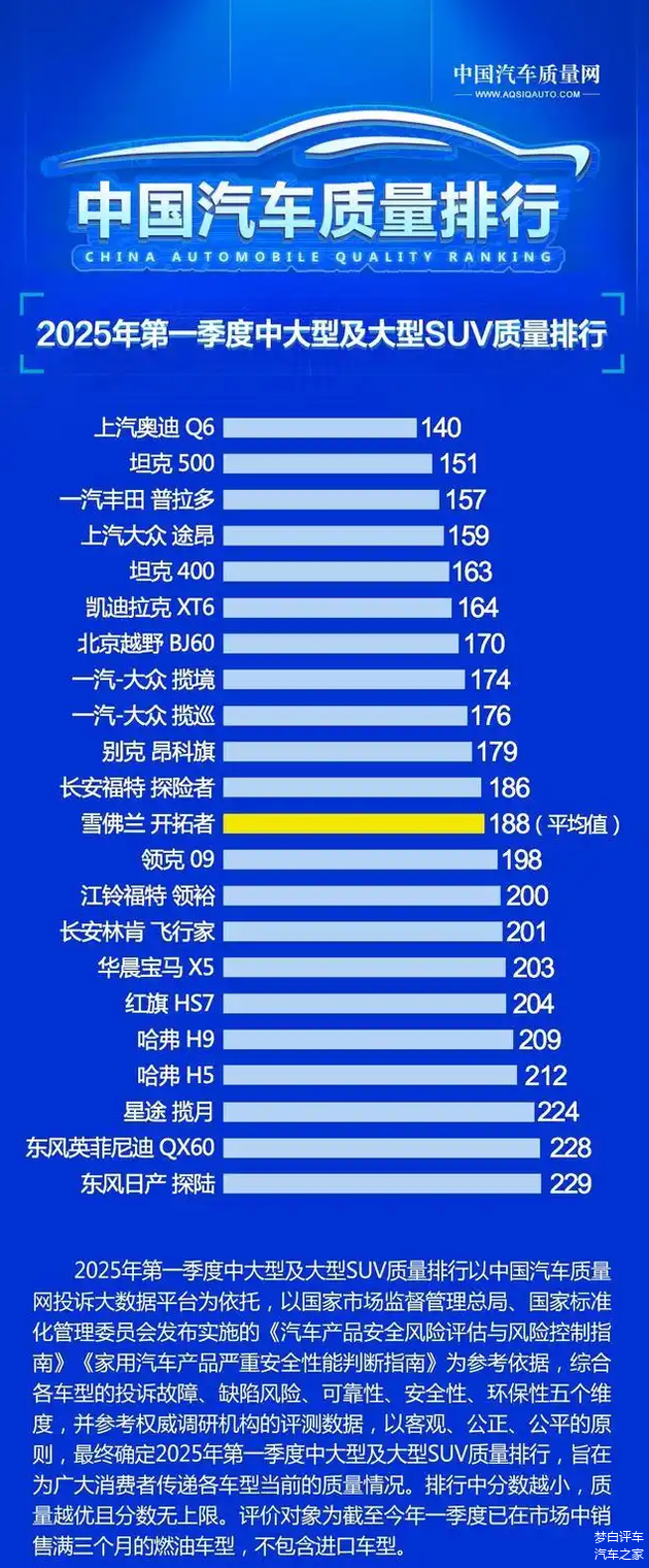 最后,2025年中大型及大型燃油SUV的质量榜,共有12款车型质量达标,其中有三款是国产车,坦克500高居第二,坦克400和北京越野BJ60也是入榜前八!其它车型方面,奥迪Q6、丰田普拉多、大众途昂等知名车型,质量表现都排名前五位,凯迪拉克XT6来到了第六位,揽境、揽巡、昂科旗和开拓者同样是表现不俗。