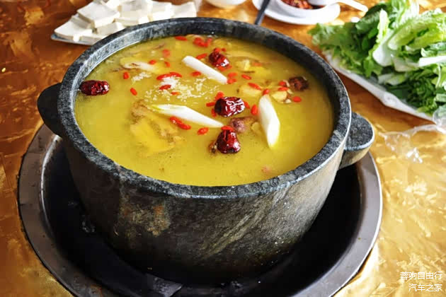选用的是藏香鸡,辅以手掌参、天麻等四五种药材,用慢火炖制,汤中有一股淡淡的药材清香,鸡肉嫩而有弹性。炖鸡用的石锅是用一种叫做“皂石”的云母石砍凿而成,而这种石头仅产于墨脱,要靠背夫从墨脱把原始石材背出来后,再由门巴族人用整块石材手工细心凿制。