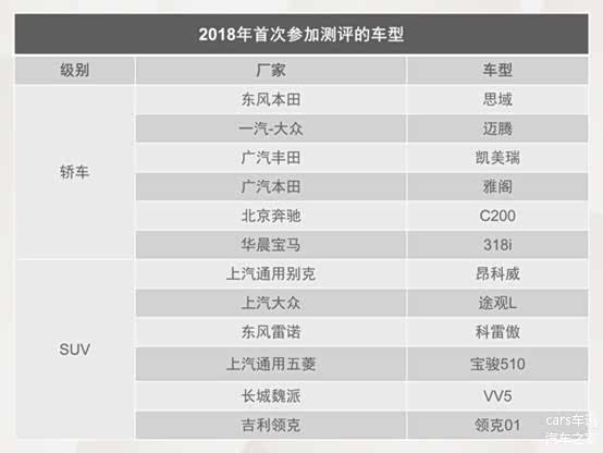 这次参加评测的车型是由管理中心在市场正规渠道随机购买的。12款车型包括:东风本田思域、一汽-大众迈腾、广汽丰田凯美瑞、广汽本田雅阁、北京奔驰C200、华晨宝马318i共6款轿车,上汽通用别克昂科威、上汽大众途观L、东风雷诺科雷傲、上汽通用五菱宝骏510、长城魏派VV5和吉利领克01共6款SUV,其中长城魏派VV5和吉利领克01为自愿申请车型。