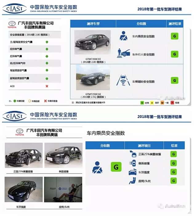 凯美瑞较同级竞争对手本田雅阁略胜一筹,美版车型IIHS测试成绩与国内版本相同。首先该车配备气囊的数量明显多于对手,且各气囊面积充足,能够提供更多保护的空间。这要得益于丰田的 TNGA 架构,采用了新的激光螺旋焊接技术,其车身刚性增加了 65%,加上 TSS 智行安全和标配十个气囊,这样的水准也让凯美瑞在北美的测试中获得 " 超 5 星安全车型 " 的称号。