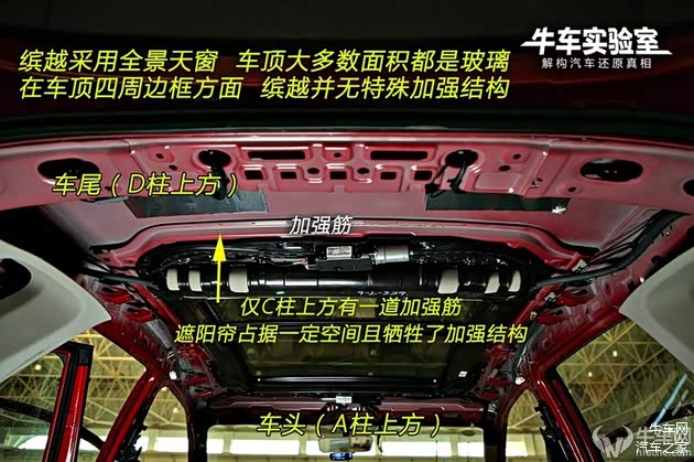 缤越采用全景天窗,因此车顶绝大多数面积都是玻璃。在车顶四周边框方面,缤越并无特殊加强结构,也没有出现加强板。仅在C柱位置有一道很窄的加强筋,后部遮阳帘占据了一定空间且牺牲了加强结构。