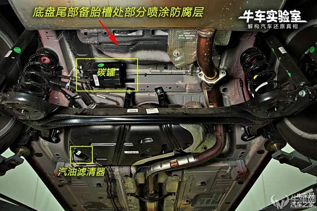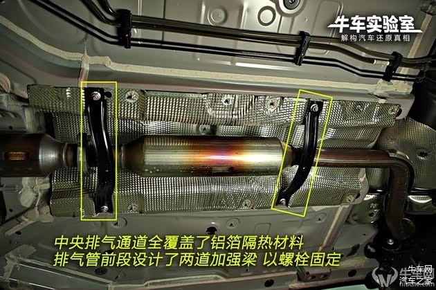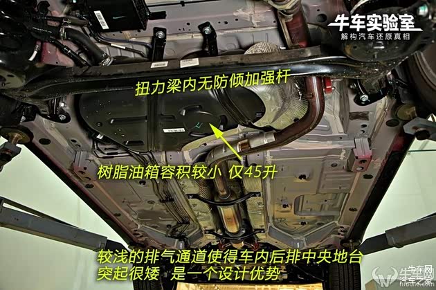 中央排气通道全覆盖了铝箔隔热材料,排气管前段设计了两道加强梁,以螺栓固定。较浅的排气通道使得车内后排中央地台突起很矮,是一个设计优势。后扭力梁内并无防倾杆,牺牲了部分稳定性,降低了成本。