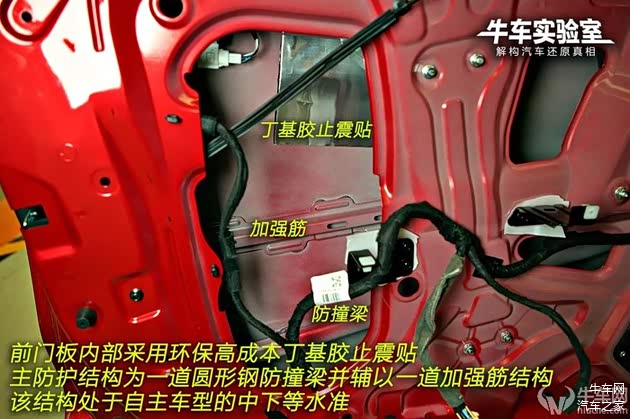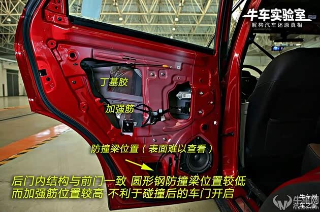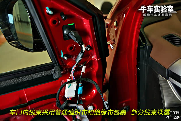 车门内线束采用普通编织布和绝缘布包裹,部分线束裸露。后门内结构与前门一致,圆形钢防撞梁位置较低,而加强筋位置较高,不利于碰撞后的车门开启。