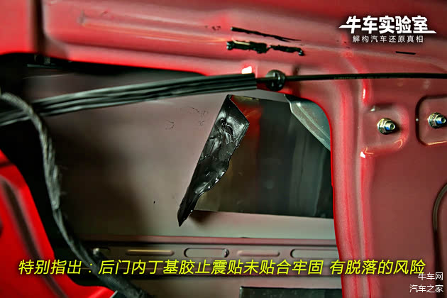 后门内丁基胶止震贴未贴合牢固,有脱落的风险。此外,车门内饰板贴合了大面积原生隔音棉,起到较好的隔音效果。