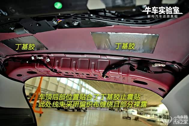 车顶后部位置贴合了丁基胶止震贴,此处线束采用编织布缠绕且部分裸露。此外,车顶内饰板贴合大面积原生隔音棉。