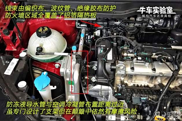 防冻液导水管与空调冷凝管布置距离过近,虽然专门设计了支架,但在行驶颠簸中依然有互相摩擦的风险。机舱内线束由编织布、波纹管、绝缘胶布防护,总体比较完善。防火墙区域全覆盖了铝箔隔热板,ABS泵贴近防火墙,设计合理。仔细观察发现,铝箔后面并无毛毡层。