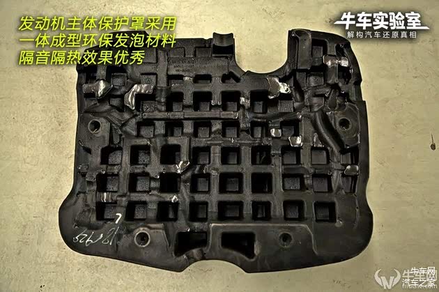 发动机主体保护罩采用一体成型环保发泡材料,隔音隔热效果优秀。从外观来看,很像普通的树脂材料,只有用手触摸才能发现玄机,软性且弹性很好。